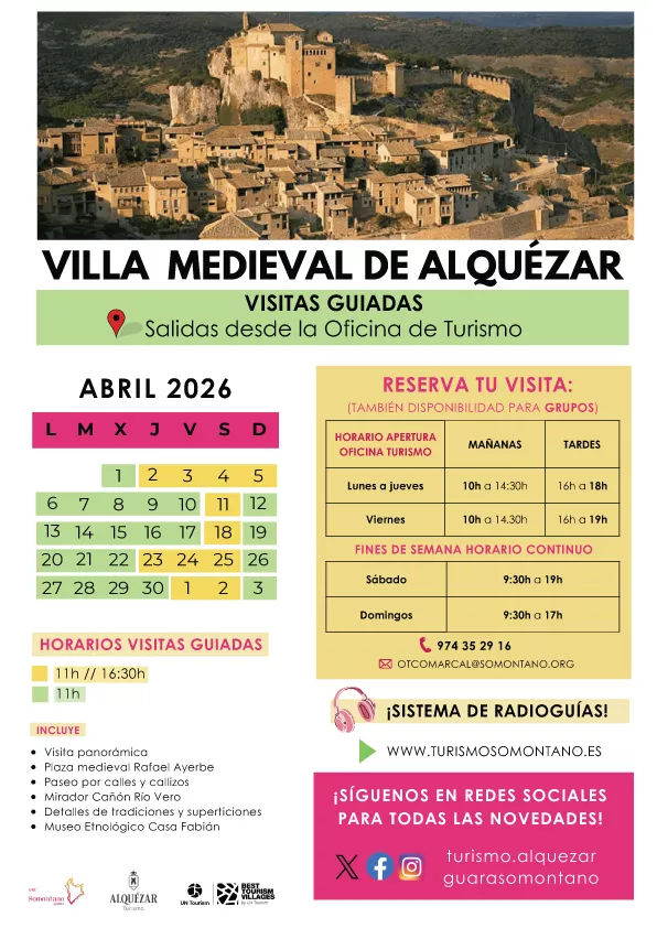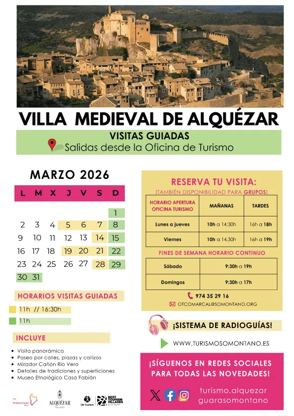 Desde la Oficina Comarcal de Turismo Guara Somontano en Alquézar, se ofrece todo tipo de información sobre los recursos y servicios turísticos de la comarca y de la localidad. También se realizan diferentes visitas guiadas por la villa.