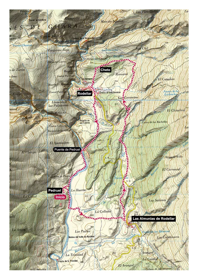 Starting from Pedruel, the route begins by going up the road to Las Almunias, and from there a succession of footpaths and tracks to the pretty village of Cheto. From Cheto to Rodellar and from Rodellar to Pedruel, the route continues mainly on narrow paths, which are surprisingly flat and accommodating in comparison to the usual routes in the Sierra de Guara.