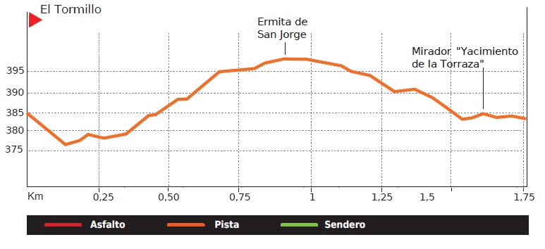 El recorrido parte de la población de El Tormillo y recorre el fondo del valle de la Clamor, entre sasos y muelas de arenisca. Asciende primero, al cerro de la Ermita de San Jorge, desde donde se puede observar el paisaje estepario de sasos y vales (o toyos – barrancos de fondo plano y laterales verticales), y tras descender, el camino continúa siguiendo las flechas de “La Torraza” hasta el “Yacimiento de la Torraza” (aldea de repoblación durante la expansión de Alfonso I “El batallador” en el año 1.100, que, posteriormente, se abandonó).