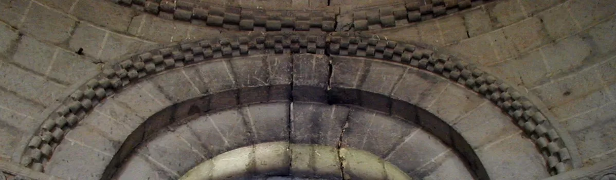 In the apse there is one deep opening that reaches the interior. The arch features double edging outlined with a chequered moulding and the facia is decorated with floral inscriptions. The single window represents Christ, Lux Mundi and faces the east. This is where the sun rises every morning; the direction of the Garden of Eden and the Holy Land where Christ became man. It is also said to be the origins of the day of reckoning that will mark the end of time. In this way, the people of the Romanesque era entered the temple and symbolically passed from the darkness to the light, from earth to heaven.