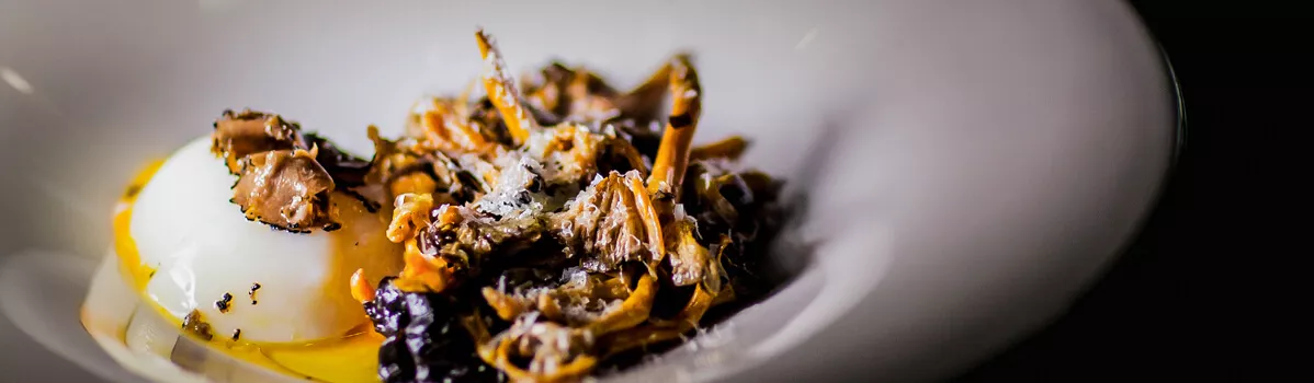 SAVOUR poached eggs with cantharellus and truffle, with a white barrel-fermented wine