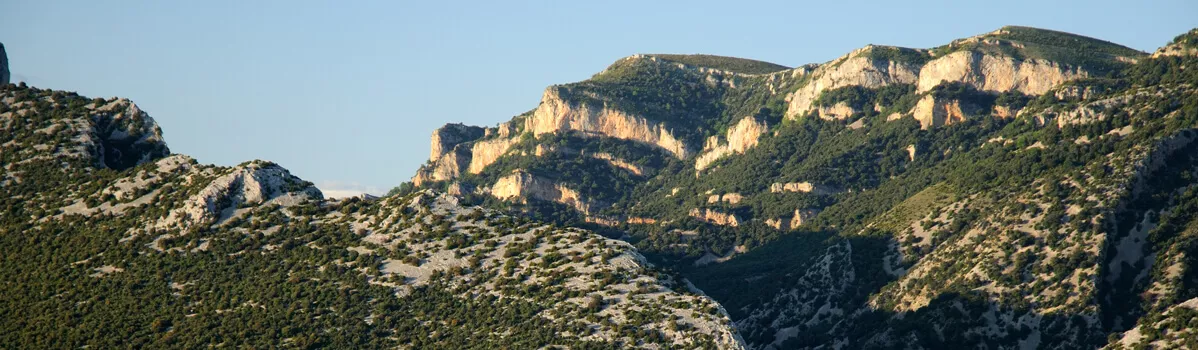 This undulating valley is clearly visible from the main road that runs from Bierge to Rodellar. It was formed by the River Isuala and follows the curved line of an anticlinal fold and is framed by a series of crests that represent all that remains of eroded layers.