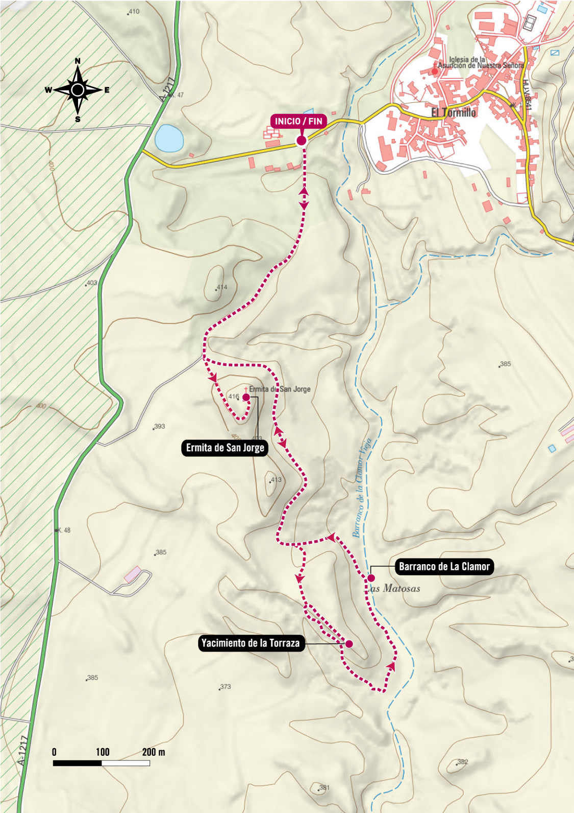 The walk starts from the HU-V-8541 road, about 200 meters from the village, and follows a track towards the hermitage of Saint George. It continues to the la Torraza archaeological site, an impressive group of anthropomorphic tombs overlooking the Clamor ravine.