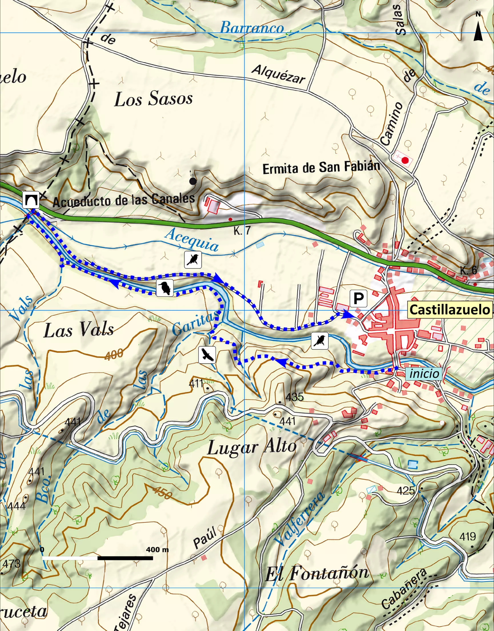 The circular route begins in the core of Castillazuelo, after crossing the Vero River bridge. The route (marked as “Rals Vals de Castillazuelo”) runs along the right bank of the Vero River, heading West until you reach a waterfalls area, where you cross again and head back to the town along the opposite bank. The route runs along the shore of Vero River in a landscape where garden areas and riverside woodlands contrast with oak woodlands and cultivated fields (cereals and almonds). In this section, the Kingfisher nests in the hollows of the rocks.