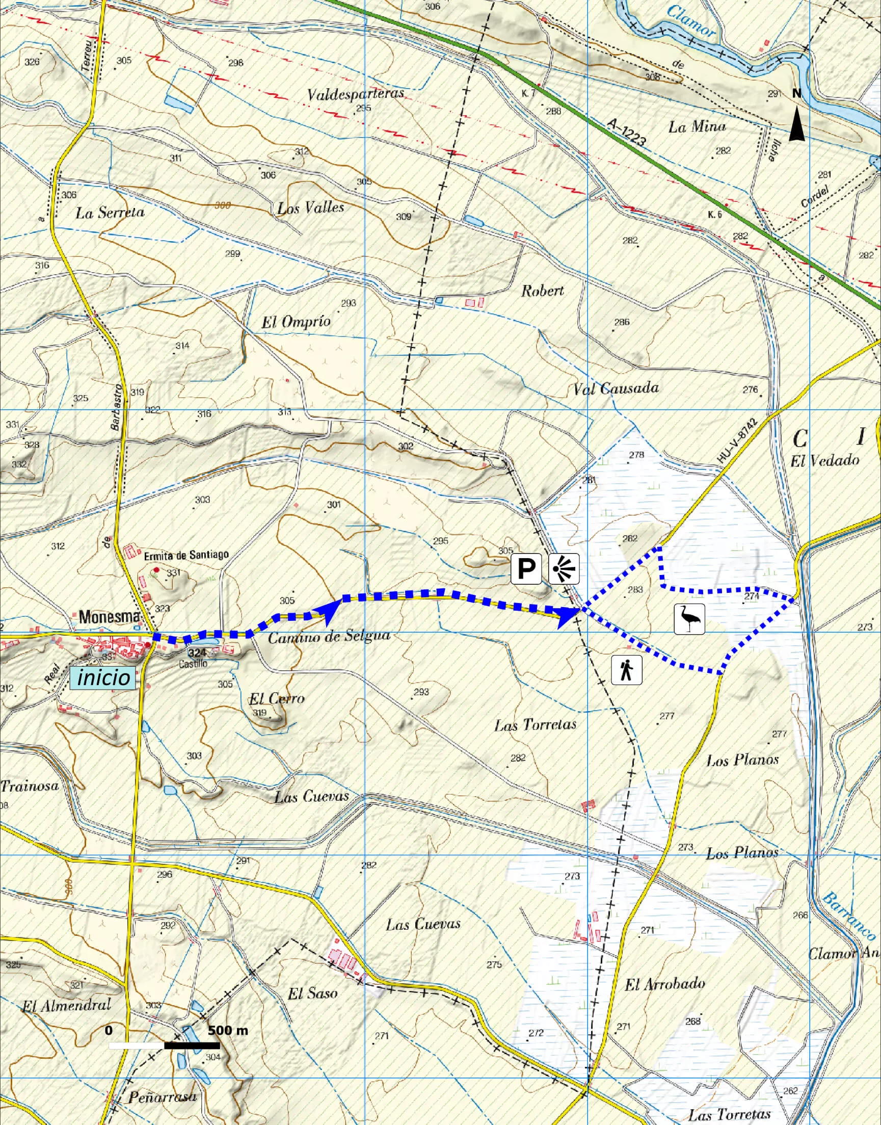 The route begins in Monesma, taking road HU-V-8742 towards Selgua (NE), across lucerne, corn and rice fields. In a short course of about 4 km, we can observe, at different times of the year, waders such as the European Golden Plover, Hen Harrier, Merlin and Lapwing. After just 2,1 km, at a junction where we can park the car, it is possible to observe a Common Crane roost, in southeast direction among the rice fields. From there, you can come back on foot bordering these fields, in case you want to get closer to the Cranes.
