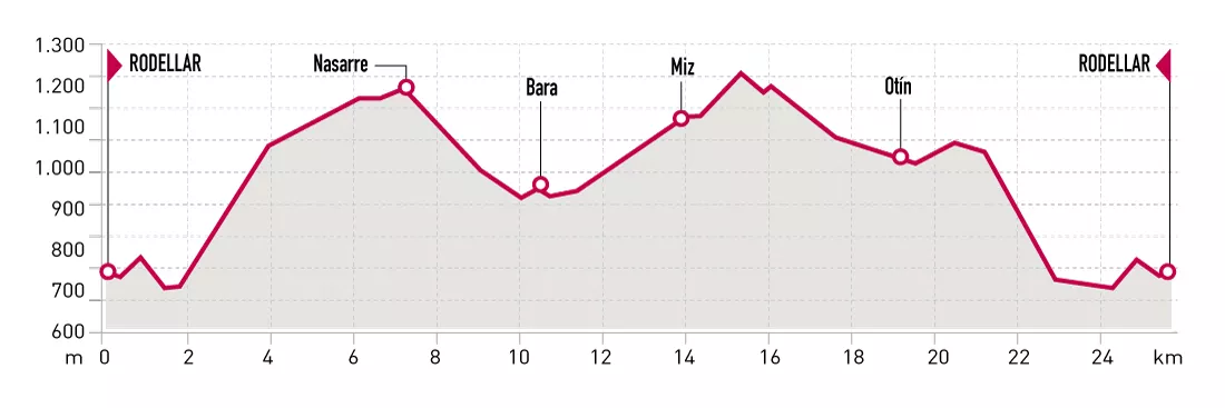 From Rodellar, the route goes down to Mascún River Canyon going up to Nasarre by Andrebot ravine and passing by Losa Mora Dolmen. It follows GR 1 trail from Nasarre to Bara, the only place where it is possible to get some water. From Bara, it follows Alcanadre river course. It goes up to Miz and later climbs to Collada del Aire. From Otín, it goes back to Rodellar by the so-called «La Costera», a spectacular last section running along Mascún River Canyon.