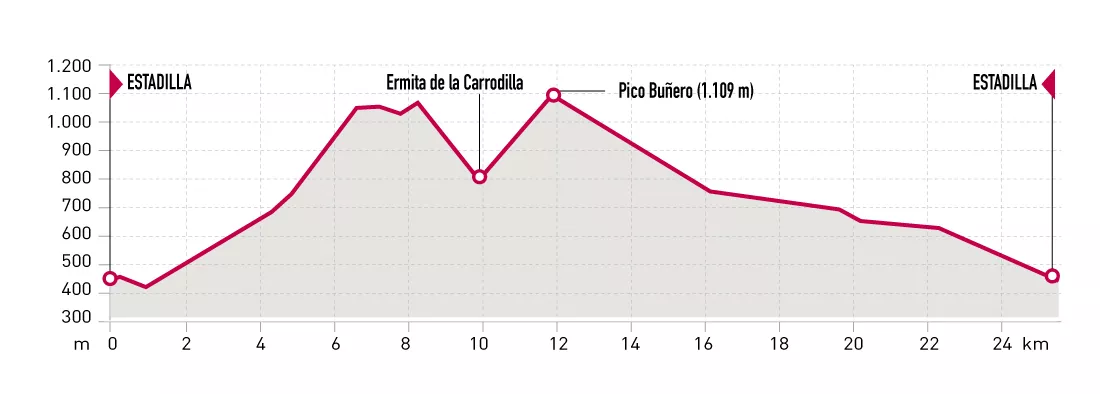 We propose the 2016 edition circuit consisting of a demanding first section leading to Maroz ravine and «Peña de los Alpargateros» through a series of beautiful singletracks and descending from the top of the mountain towards Carrodilla sanctuary by GR 18 trail, where it ascents to Buñero peak (1109 m). The way back to Estadilla passes by the Mentirosa Fountain. This second section is less demanding and consists of a series of mainly descending unpaved roads with no steep climbs.