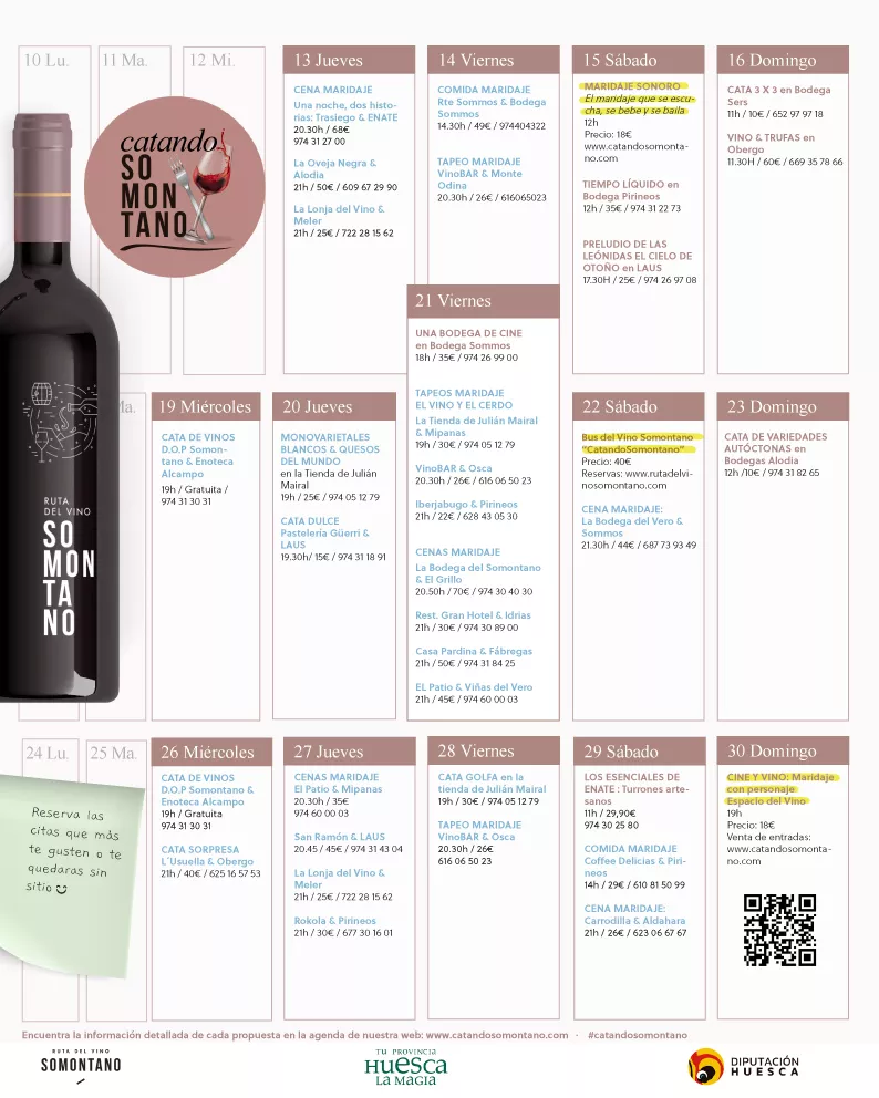 La Ruta del Vino Somontano vuelve a organizar del 1 al 30 de noviembre el Mes del Enoturismo con más de 50 propuestas en torno al vino y la cultura como degustaciones, maridajes, música, arte o experiencias en bodegas.