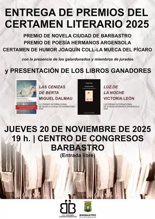 El Auditorio del Centro de Congresos acoge este 20 de diciembre a las 19.00 el acto de entrega de los Premios del Certamen Literario 2025 y la presentación de ‘Las cenizas de Berta’, la novela ganadora del LVI Ciudad de Barbastro y ‘Memoria del Futuro’, el poemario de Victoria León Varela distinguido con el LVII Hermanos Argensola. El acto servirá también para entregar a Elena Bethencourt el Premio de Relato de Humor Hiperbreve Joaquín Coll-La Mueca del Pícaro.