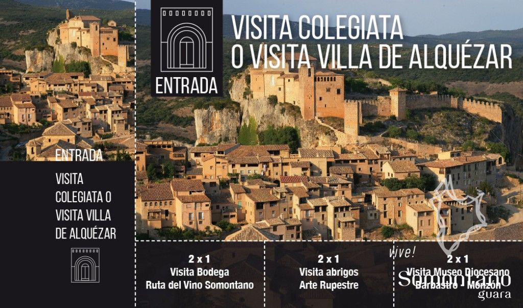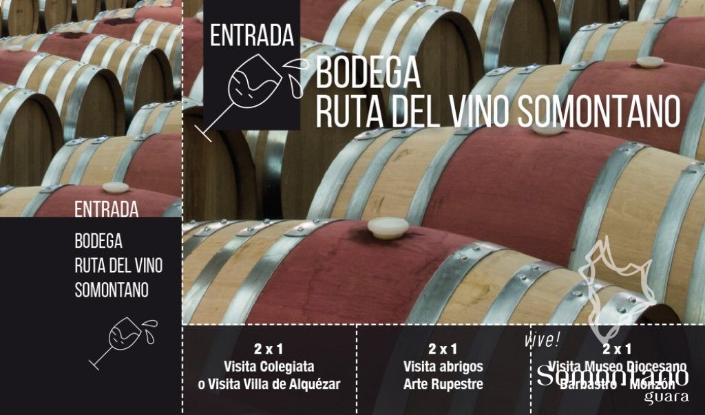 Son pases que recogen descuentos 2x1 para visitar otros atractivos de la zona. Al visitar uno de los centros asociados a esta promoción, el cliente recibirá un descuento 2x1 en la visita al resto de recursos. Por ejemplo, al visitar una bodega adherida al programa, recibirá un descuento de 2x1 en una visita a la Colegiata o a la Villa de Alquézar, a un abrigo del Arte Rupestre y al Museo Diocesano. ¡Una idea genial para poder conocer otros puntos interesantes del territorio y a precio reducido! ¿Quien da más?