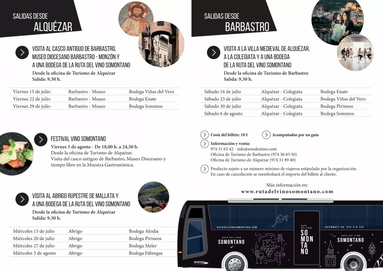Un total de 12 viajes en autobús recorrerán este verano Guara Somontano permitiendo al visitante disfrutar de diferentes bodegas, del arte rupestre, del Museo Diocesano Barbastro-Monzón, del casco histórico de Barbastro y de la Colegiata y Villa de Alquézar.