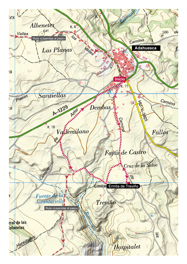 Desde el aparcamiento situado en la carretera que viene de Abiego, el trazado comienza siguiendo la ruta Leyendas al Paso hacia la ermita de Treviño, en la que podremos observar el templo de origen románico y su claustro. Luego, se debe deshacer un tramo del camino hasta encontrar la indicación a las fuentes. Tras un bonito tramo de sendero, dejamos la ruta señalizada para retornar por una cómoda pista a Adahuesca.