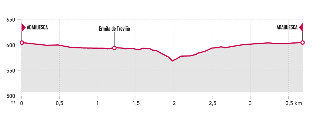 Recorrido sencillo y corto que permite conocer el entorno de Adahuesca, donde se encuentran la ermita de Treviño, catalogada como Bien de Interés Cultural y las fuentes que abastecían de agua a la población.