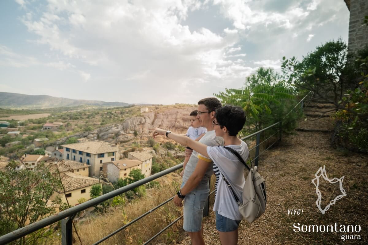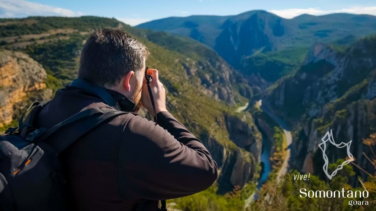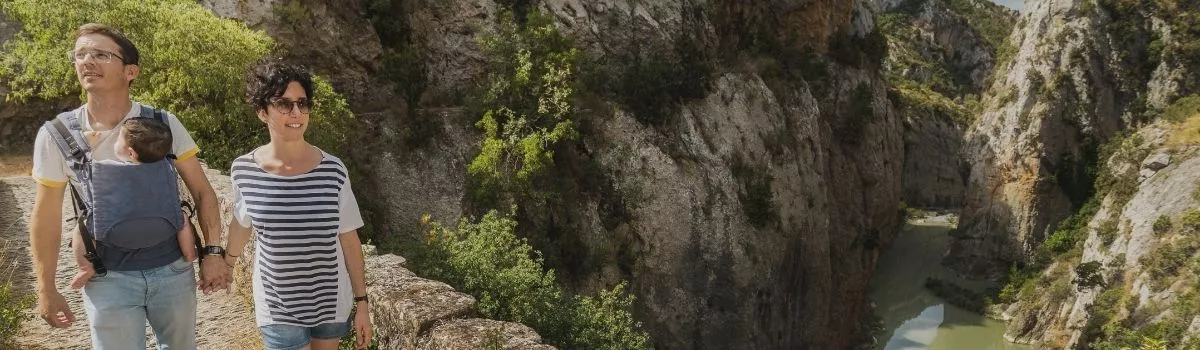 En cuanto lleguéis de nuevo al pueblo, dirigíos hacia el mirador, siguiendo las indicaciones que os llevarán hasta una cuesta asfaltada algo empinada. Pero no desistáis, porque la vista desde arriba es todo un regalo. Nada más llegar, impresiona la visión del Congosto de Olvena. Un congosto es un desfiladero entre montañas y en este caso se ha formado por la acción erosiva del río Ésera. Es tan especial que está catalogado como Punto de Interés Geológico. Desde el Mirador también podréis observar a vuestra izquierda una pared rocosa donde tiene su nido el buitre leonado. Podéis ver los posaderos a simple vista. Solo tenéis que buscar esas manchas blancas en la roca que no son otra cosa que los excrementos de los buitres.