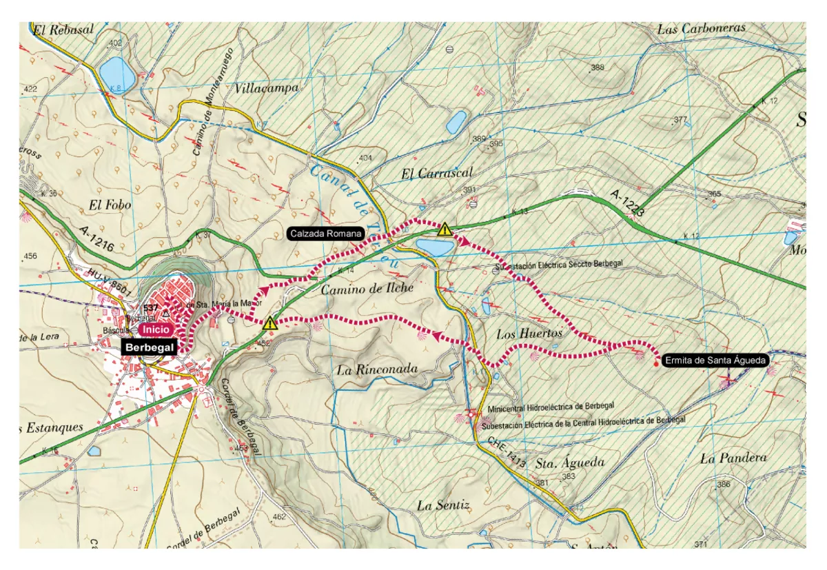 El recorrido propuesto tiene su punto de inicio en la parte alta del pueblo para, además de las vistas, poder admirar sus hermosas casas solariegas, como el actual Ayuntamiento y su imponente iglesia. Tras descender del casco urbano, la ruta se dirige a la ermita románica de Santa Águeda por la antigua Calzada Romana Ilerda-Osca, de la que solo se conservan algunos tramos. Luego discurre por caminos agrícolas en perfecto estado hasta la ermita, rodeada de un curioso entorno con grandes rocas de arenisca. El regreso a Berbegal se realiza de manera más directa por buenos caminos.