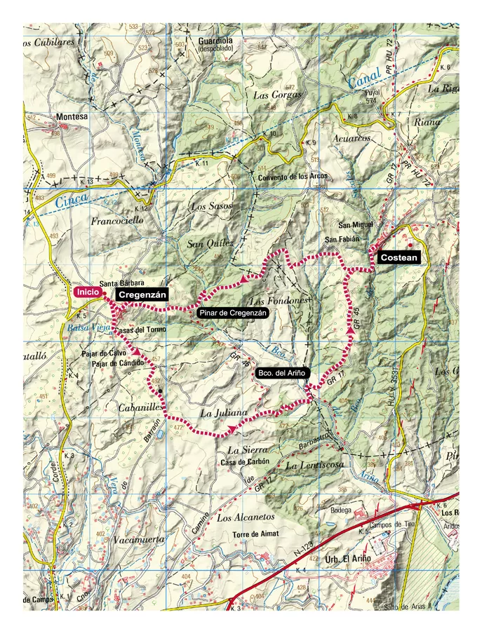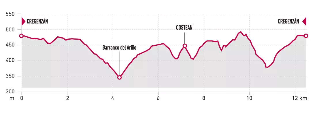 Consta de dos partes bien diferenciadas: la ida de Cregenzán a Costean se realiza por pistas agrícolas en perfecto estado. La subida desde el barranco de Ariño a Costean se efectúa por el GR 17 (Vía Arán-Pirineos del Camino de Santiago), recientemente señalizado. El regreso desde Costean transcurre en su mayor parte por el estrecho y bonito sendero de San Fabián, que recorre el Pinar de Cregenzán.