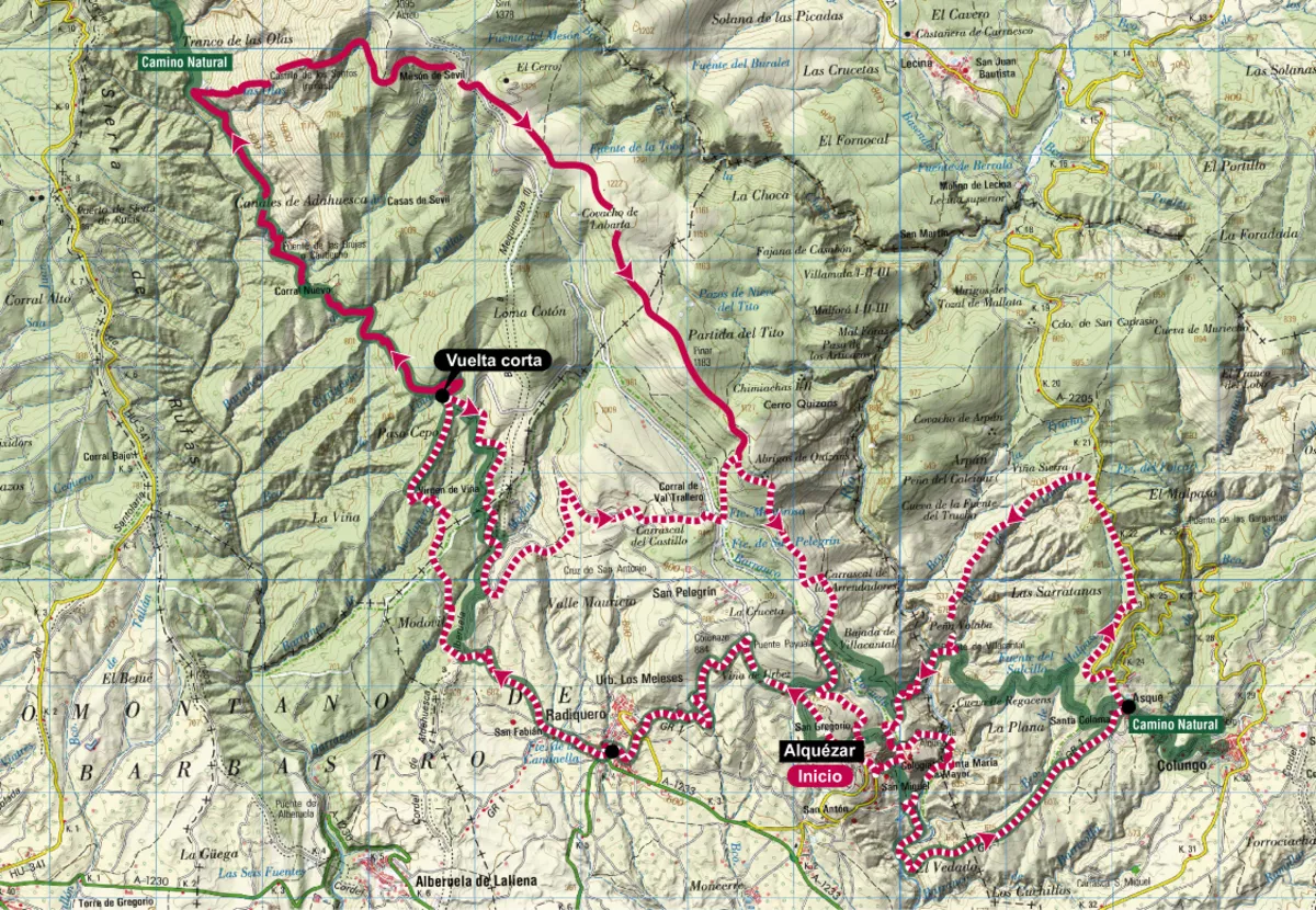 En esta ficha presentamos dos variantes de la ruta Trail: el trazado más corto corresponde con la ruta habitual de 38 km y 1890 m de desnivel acumulado, mientras que el trazado largo cuenta con 43,4 km y corresponde a una ampliación del mismo con el ascenso al Mesón de Sevil por el Castillo de los Santos. En ambos casos resulta un recorrido fantástico por el entorno de Alquézar, el río Vero y los senderos del Parque Natural de la Sierra y los Cañones de Guara.