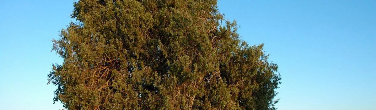 Tiene una altura total de 10´4 m. y 3 m. de perímetro en la base de su tronco. A 2´60 m. del suelo se divide en varias ramas. Sorprende que en el interior de su tronco crezca un litonero (Celtis australis) que desgaja en dos el del enebro, aunque no lo daña. Los dos árboles se encuentran en buen estado de conservación. Es de propiedad particular.