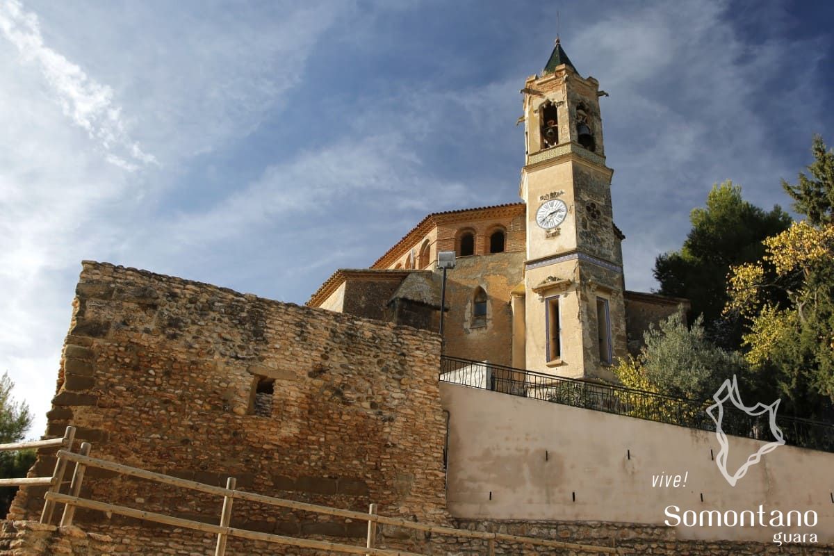 La antigua torre del castillo fue utilizada como campanario hasta que a principios del siglo XX se erigió la actual. En la puerta puede verse la fecha 1911. Su decoración de gárgolas, la fina tracería neogótica, o las proporciones de la torre le confieren un cierto aire neogótico que hace de ella una de las pocas obras de carácter historicista conservadas en el Somontano.