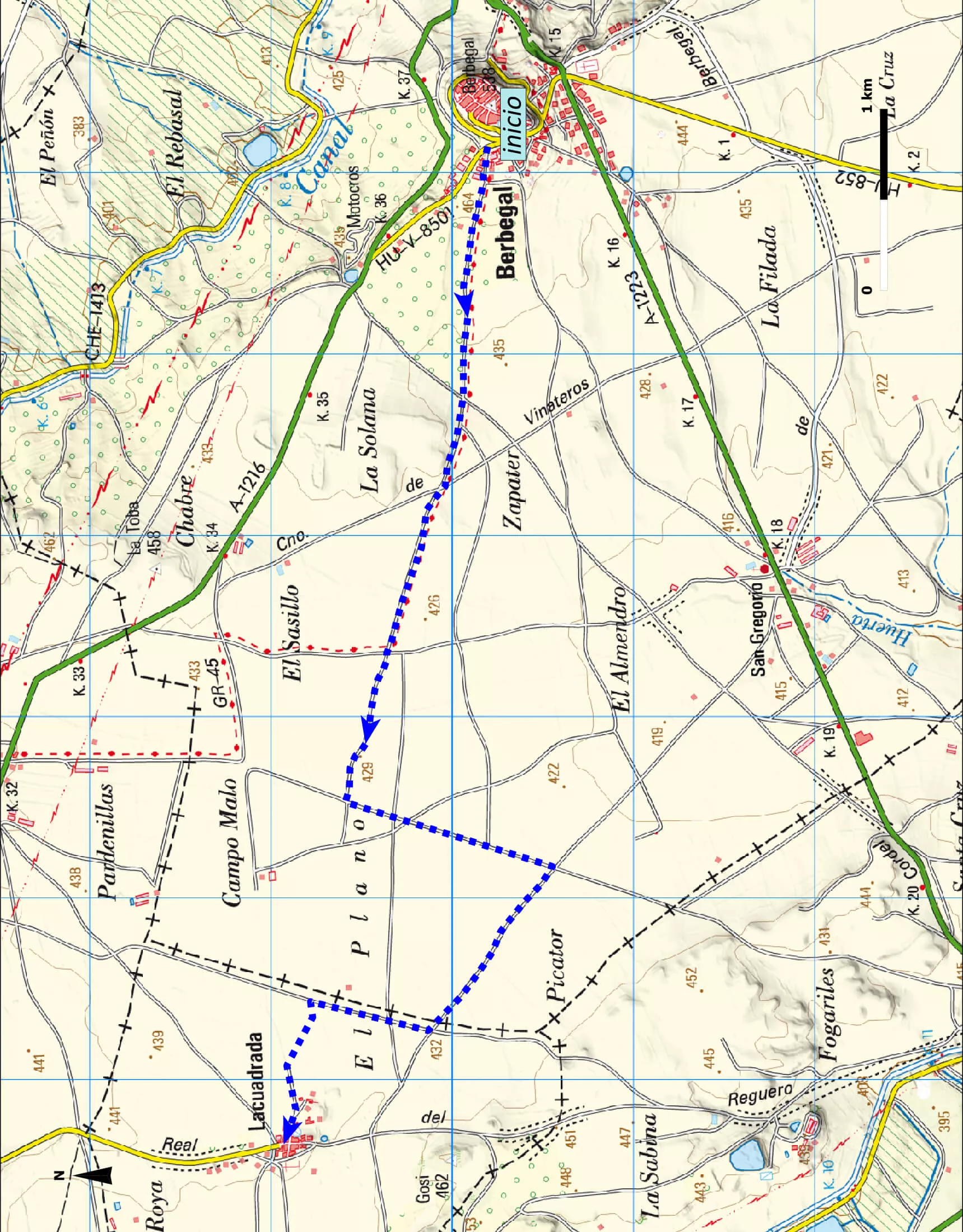 Le sentier qui emprunte le GR-45 démarre à Berbega à côté de la bascule municipale, et mène au hameau de Lacuadradra (fin de l'itinéraire). Le retour se fait par le même chemin. Le parcours aller de 7,8 km peut s'effectuer à pied, en vélo ou en véhicule tout-terrain. Le sentier traverse une plaine de cultures céréalières avec de nombreuses jachères et parcelles où pousse la végétation naturelle ainsi que quelques chênes et amandiers. Il est recommandé d'effectuer cette randonnée au printemps et en été afin d'observer le rollier d'Europe, des outardes canepetières mâles et des faucons crécerelles.
