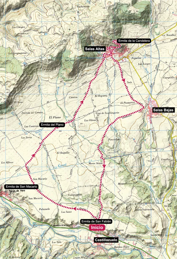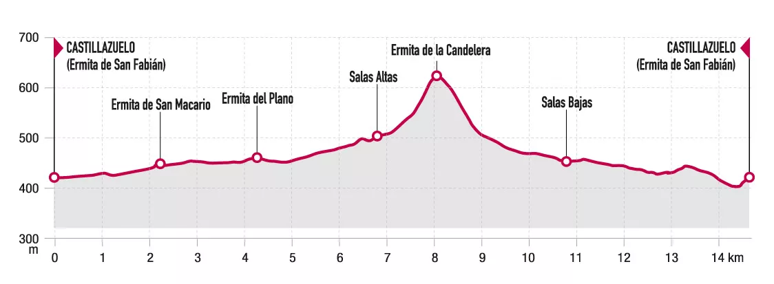 Partant du cimetière de Castillazuelo, où se trouve l’ermitage de San Fabiàn, le parcours suit une piste confortable, parfois même asphaltée, à travers la plaine entre Pozàn de Vero et Salas Altas, en passant par les ermitages de San Macario et El Plano. À Salas Altas, nous montons jusqu à l’ermitage de Candelera, le point culminant de I'itinéraire, puis nous descendons, d’abord à Salas Bajas, puis à Castillazuelo.