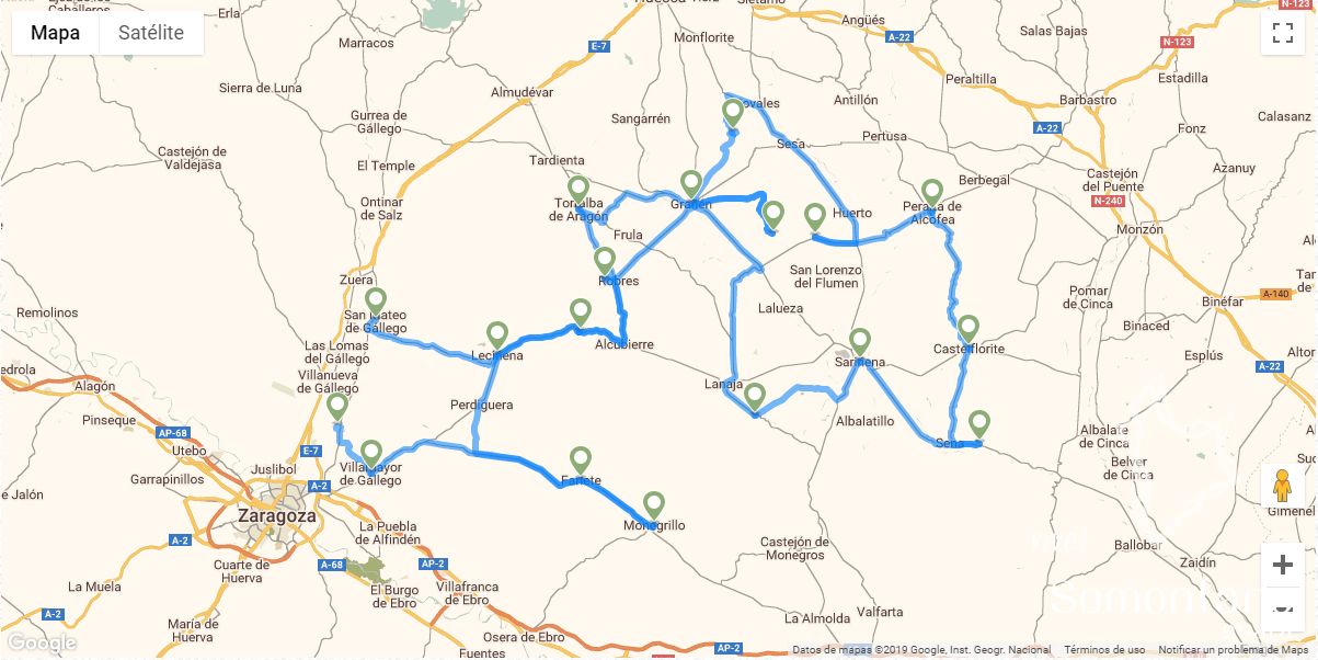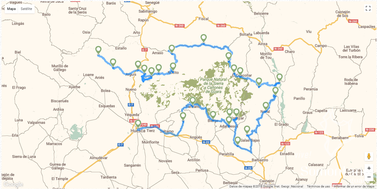 - Départ de Huesca: Huesca - Ibieca - Panzano - Bierge - Adahuesca - Radiquero - Alquézar - Pozán de Vero - Salas Altas y Salas Bajas - Naval - Abizanda - Ligüerre de Cinca - Olsón - Paules de Sarsa - Sarsa de Surta - Las Bellostas - Laguarta - Lasaosa - Nocito - Lúsera - Embalse de Santa María de Belsué - Belsué - Arguís y Túnel de Manzanera - Bentué de Rasal - Rasal.