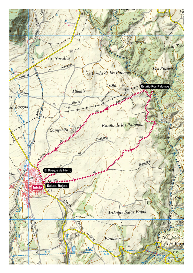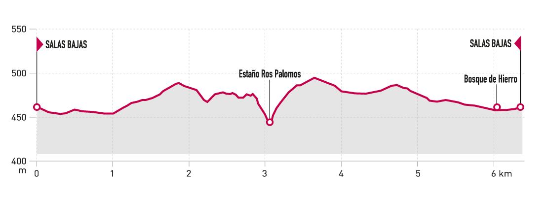 Desde Salas Bajas comienza atravesando la carretera en dirección al barranco del Ariño, donde se encuentra el Estaño ros Palomos. El último tramo hasta este bonito rincón es de sendero. Tras disfrutar del estaño y su salto de agua, la ruta regresa a Salas Bajas por pista, entre viñedos y campos de cultivo. Al acabar podremos alargar ligeramente la ruta visitando la escultura del "Bosque de Hierro", formada por vigas de hierro que se asemejan en su deformación a retorcidos troncos de árboles.