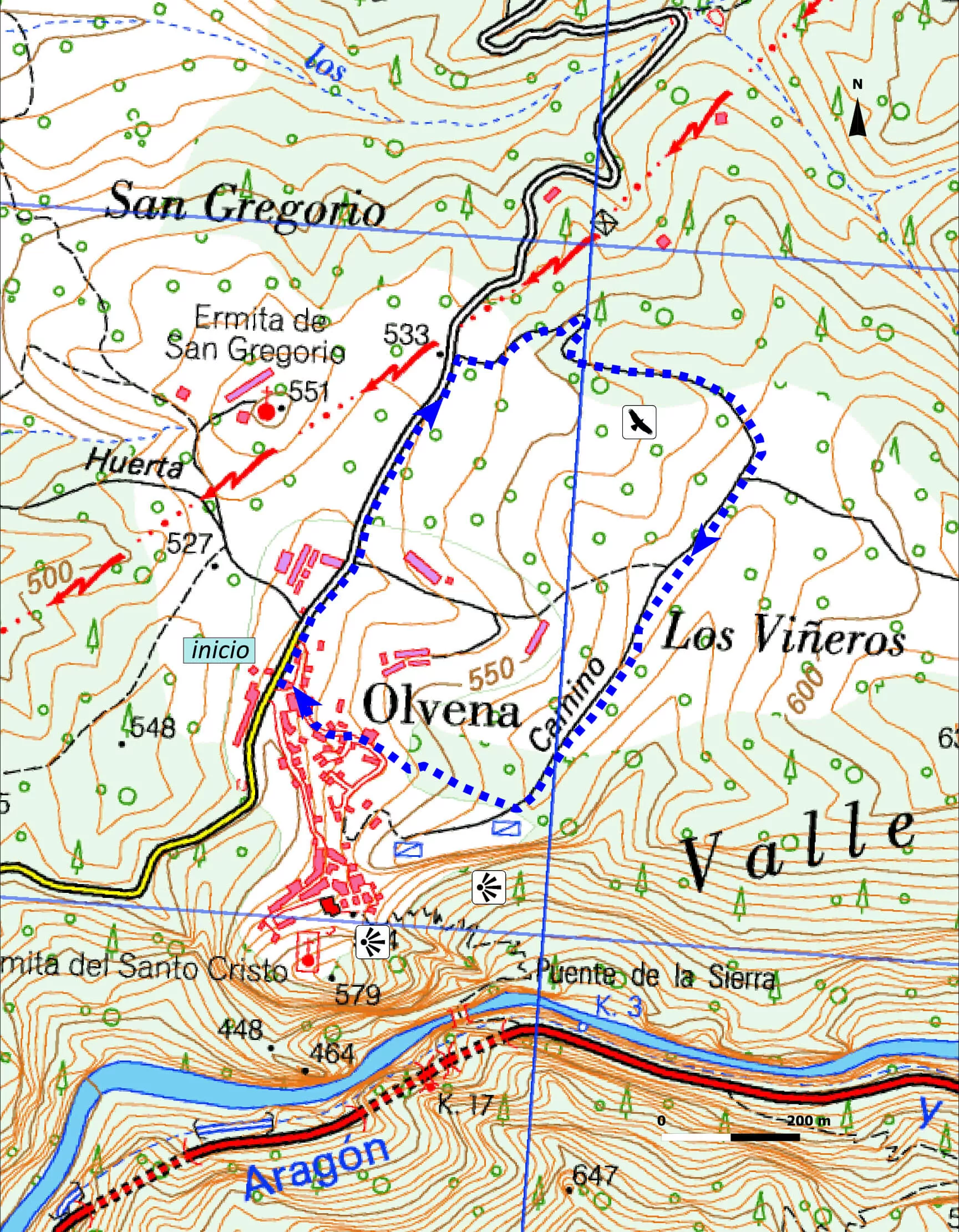 Rondwandeling/rit van 2,2 km. De eerste 500 meter loopt de route langs de weg van Olvena naar Puebla de Castro, daarna gaat u rechtsaf een zandweg op en na 600 meter neemt u een andere weg in zuidelijke richting die u weer naar Olvena brengt. De route loopt door velden in de buurt van de kloof. Daardoor is het makkelijk grote roofvogels waar te nemen die deze akkers gebruiken als activiteitsgebied. Ook raden we aan het uitzichtpunt van de Congosto te bezoeken en de "Camino del Canalillo" voor een beter uitzicht over de kloof en zijn gevleugelde rotsbewoners.