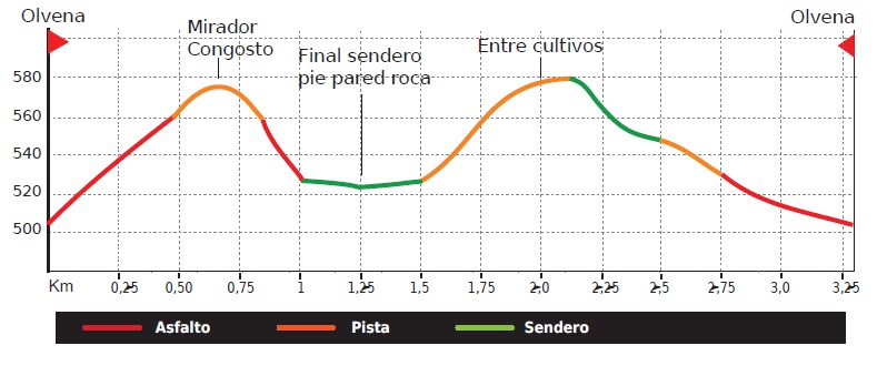 Durante el recorrido propuesto vamos a observar tres ambientes botánicos diferentes. El ambiente urbano (población de Olvena) donde destaca un bosque de litoneros (Celtis australis) y en las eras, entre calles, encontramos cañaheja (Ferula communis) y beleño blanco (Hyoscyamus albus). Confome ascendemos al mirador, nos adentramos en el ambiente del Congosto de Olvena (cañón formado en la roca caliza y arenisca por la erosión del río Ésera, catalogado como Punto de Interés Geológico), en el que se observan especies rupícolas, cuyas raíces se sujetan entre las grietas del acantilado rocoso: oreja de oso (Ramonda myconi), corona de rey (Saxifraga longifolia y S. tridacylites), atrapamoscas (Pinguicula longifolia), enebro (Juniperus oxicedrus) y sabina negral (Juniperus phoenicea). En el tercer ambiente botánico, que se encuentra en la última parte del recorrido, atravesaremos, bancales de cultivos de almendros, pequeñas islas forestales de encinas (Quercus rotundifolia) y un exclusivo enebral (Juniperus oxicedrus).