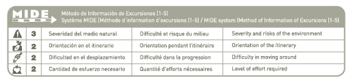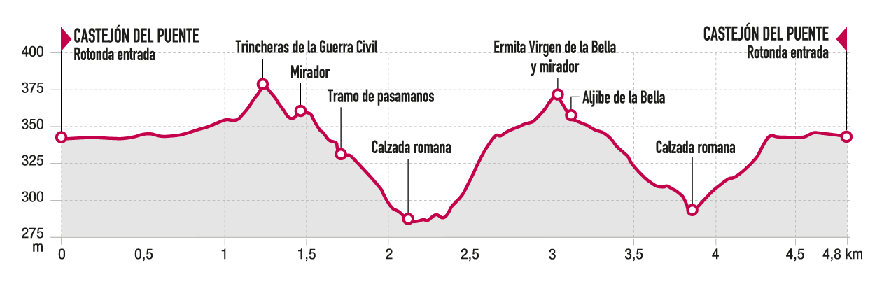 Comienza en la rotonda de acceso a la localidad y se dirige hacia las trincheras de la Guerra Civil pertenecientes a la Línea del Cinca. Tras su visita se alcanza un mirador con vistas a los Pirineos, la Sierra de Guara y el valle del Cinca.
