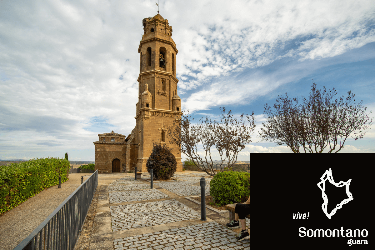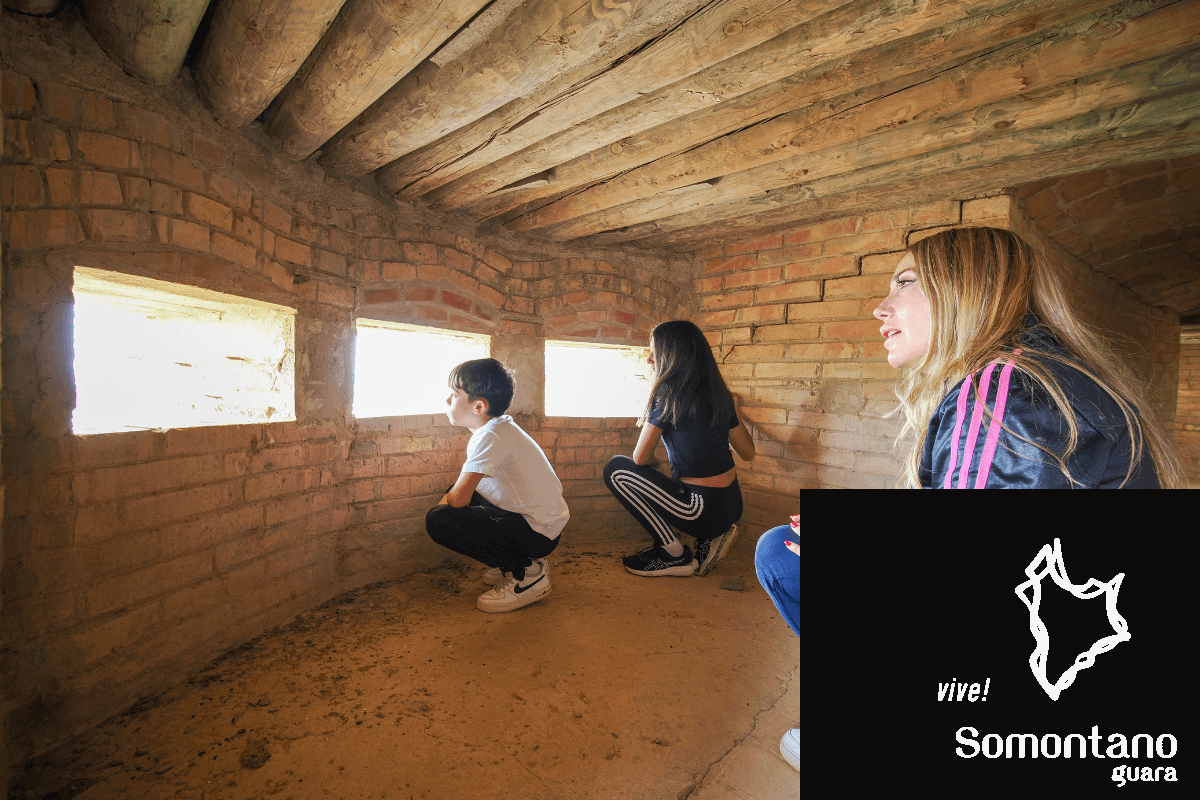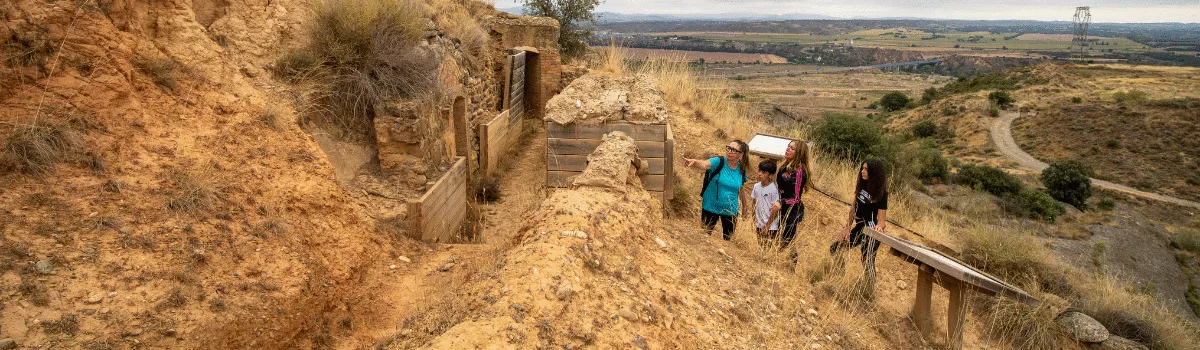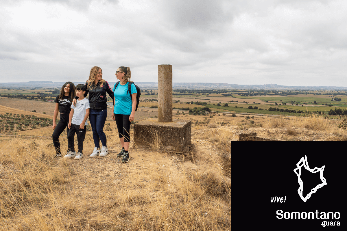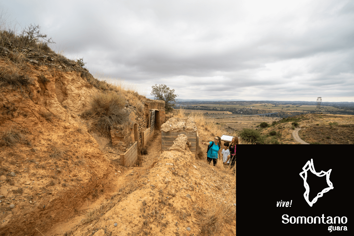 Trincheras de la Guerra Civil, vistas a los Pirineos, Sierra de Guara y valle del Cinca, calzada romana Ilerda-Osca, alijibe y ermita de la Bella.