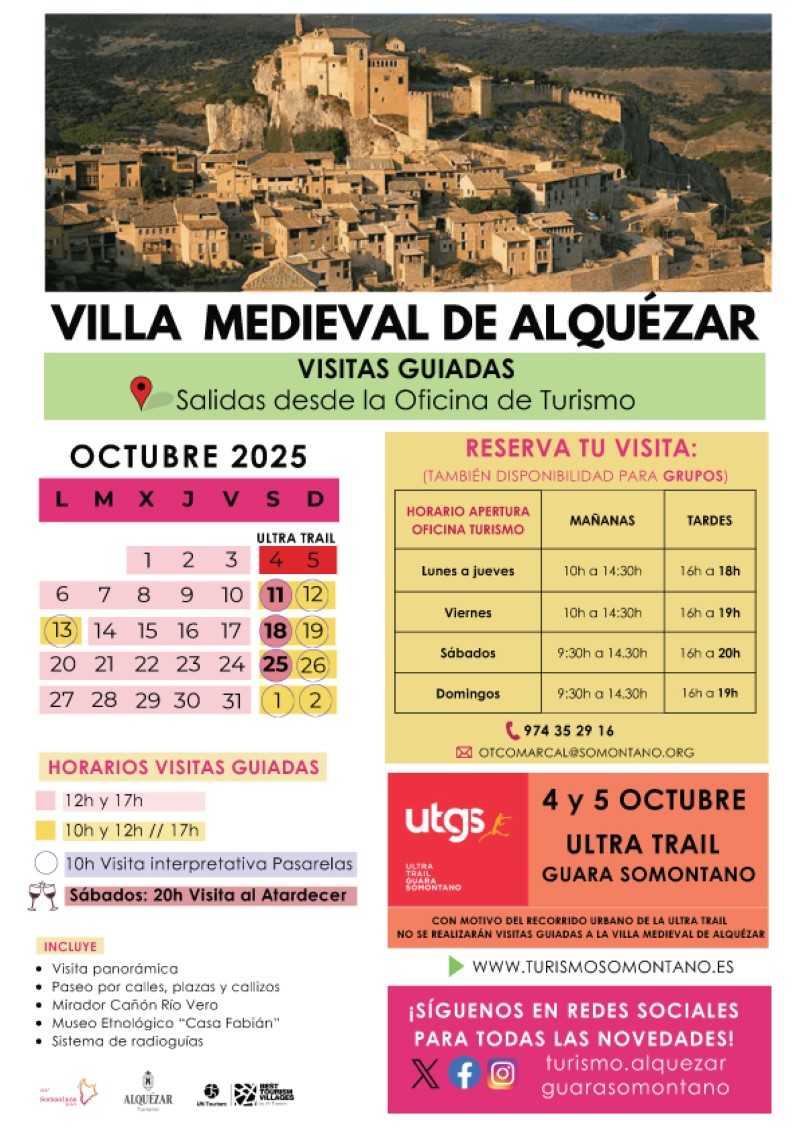 Los días 4 y 5 de octubre con motivo del recorrido urbano de la Ultra Trail no se realizarán visitas guiadas a la Villa Medieval de Alquézar ni la Ruta Interpretativa a Pasarelas, no obstante, la oficina y el punto de información de la Ruta de Pasarelas permanecerá abierta al público para dar servicio de información.