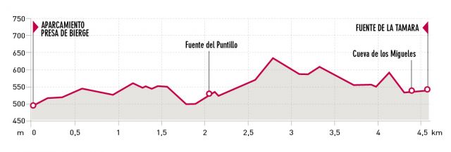 El camino que conduce a las fuentes de Tamara y de Puntillo está perfectamente amojonado y señalizado, por lo que no existe confusión alguna a la hora de seguir su trazado. La pista que debemos tomar comienza en la entrada del aparcamiento y a pocos metros del inicio encontraremos la primera de las tablillas indicativas. Tras bordear el aparcamiento por la parte superior, en dirección a un campo de almendros, podremos obtener una perspectiva completa del cauce del río Alcanadre remansado por el Salto de Bierge. Debemos continuar caminando por la misma pista hasta llegar a un cartel que marca el inicio del sendero que conduce a las fuentes. A lo largo del recorrido es posible disfrutar de amplias panorámicas del barranco por el que discurre el río Alcanadre, excavado entre sierras formadas por roca arenisca y conglomerados. Preside este paisaje el Huevo de Morrano y la Cabeza de Guara. A lo largo del recorrido se atraviesa un bosque plenamente mediterráneo de encinas y pino carrasco, así como numerosos barrancos. El último tramo del itinerario, para llegar es de 25 minutos a la Fuente de la Tamara. En este lugar existe una gran poza de aguas turquesas. Antes de abandonarla, se recomienda contemplar desde lo alto de unas rocas los espectaculares estrechos de los Fornazos, formados a partir de la disolución que las frías aguas del Alcanadre han originado en la roca caliza.