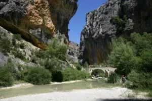 En este tramo del río Alcanadre se pueden apreciar las diferencias del modelado fluvial sobre areniscas, conglomerados y calizas.